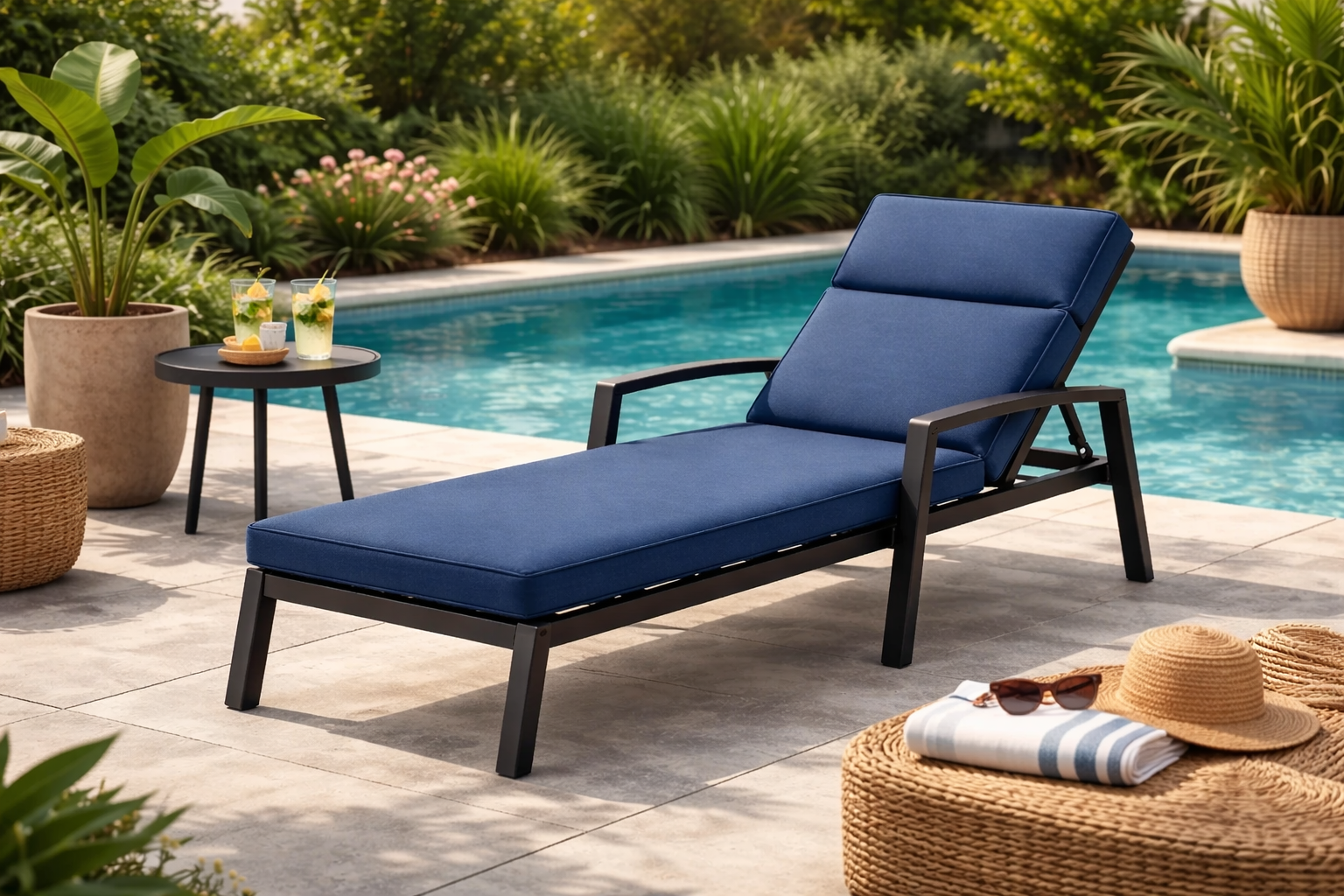 Siège allongé permettant de s’étendre ou de s’asseoir avec les jambes étendues, utilisé dans les espaces intérieurs ou extérieurs dédiés au repos.